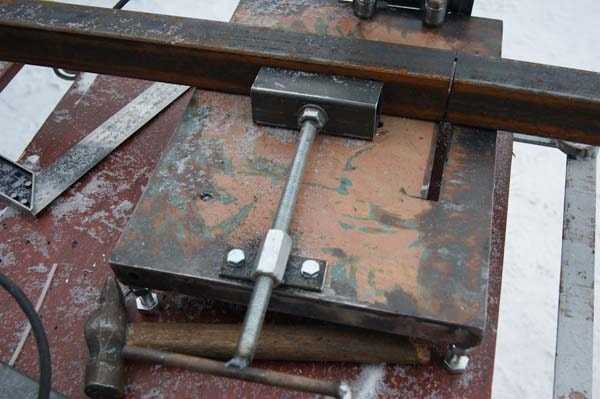 Чтобы зафиксировать деталь, к плоскости прикручивается уголок под 90 и 45 градусов, зажимается самодельной струбциной.