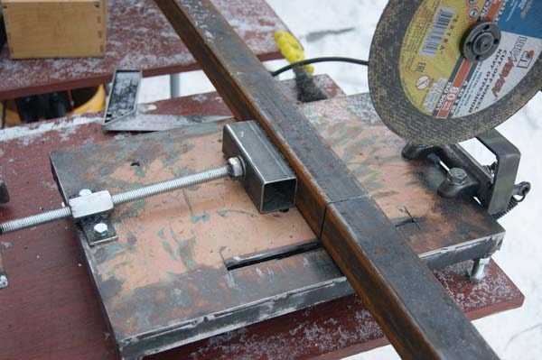 Основная часть стойки собрана, остается позаботиться об удобствах работы. Как и в предыдущих вариантах, прикручиваем к платформе упор из уголка 50×50 мм. Для лучшей видимости во время среза небольшую верхнюю часть уголка с краю можно срезать. Теперь вам будет удобно зажимать заготовку струбциной и делать ровный срез. Также не забываем покрасить станок или покрыть металл эмалью, чтобы повысить его эстетический вид и продлить период эксплуатации.