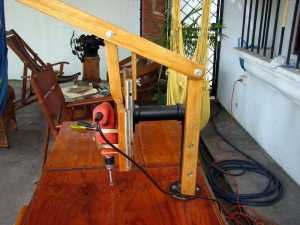 Принудительное опускание дрели осуществляют с помощью подвижной рукояти. Ее изготавливают из бруска, один конец которого закрепляют в верхней части рамы. Рычаг желательно усилить, в месте его крепления в дерево запрессовывается металлическая втулка подходящего диаметра. Фиксируют рычаг болтом.