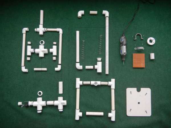 Трубы ПВХ, это материал, который без труда можно найти. Они подходят не только для водопровода, из них можно сделать много полезных вещей, даже самодельный сверлильный станок. Все материалы можно купить в магазине, главное, правильно подобрать комплектацию. Ниже на фото показаны необходимые материалы и инструменты.