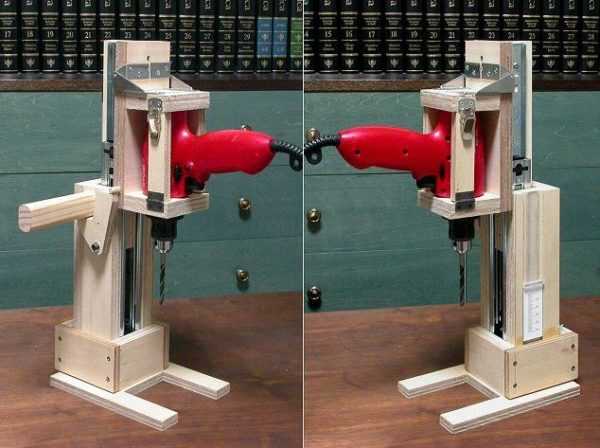 Данный станок можно назвать универсальным, так как по этому проекту вы можете изготовить различные варианты по размерам и производительности. Для этой стойки подойдет любая ручная дрель вне зависимости от мощности. Конечно, представленные выше самодельные модели из дерева сделать легче, но металл, само собой, надежней, хотя без сварочного аппарата не обойтись. Для изготовления понадобится металлическая пластина для основы и уголки для подставок.
