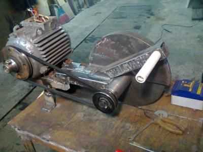 - Шкив привода устанавливается на заранее подготовленный приводной вал. Покупной или самостоятельно изготовленный отрезной диск монтируется к маятнику. При данном раскладе верхняя часть установки выступает ролью маятника, на котором размещены двигатель и диск.