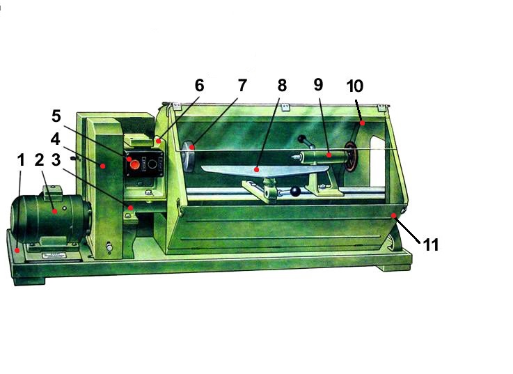 Передняя бабка — узел с несколькими функциями: крепление заготовки, передача крутящего момента через шпиндель. Вращение передается от электродвигателя посредством установленных ремней.