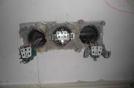 Так как на этой стене у нас располагались 3 электрические розетки, появилась дополнительная сложность в процессе монтажа. Одну розетку мы закрыли, от второй вывели провод для розетки в другом месте, а на последнюю поставили двойную розетку. Подготовительные работы нужно провести до монтажа панелей, чтобы осталось только поставить розетку. Применительно к монтажу панелей: дойдя до розетки, вырезаем в панели нужную часть, также подрезаем следующую панель. Закрываем все розеткой.