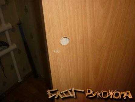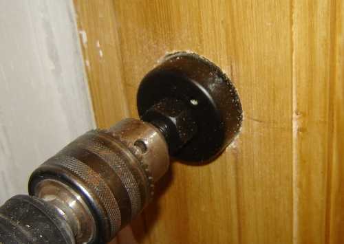 Коронкой на 50 мм делаем врезку с одной стороны двери.