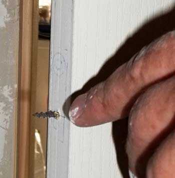 Берем саморез подходящей длины, закрываем дверь по прихлопу коробки и через отверстие 50 мм заводим саморез в оставшееся отверстие 4 мм и нажимом делаем отметку в дверной коробке.