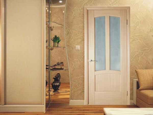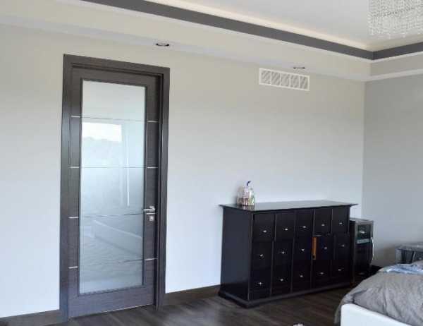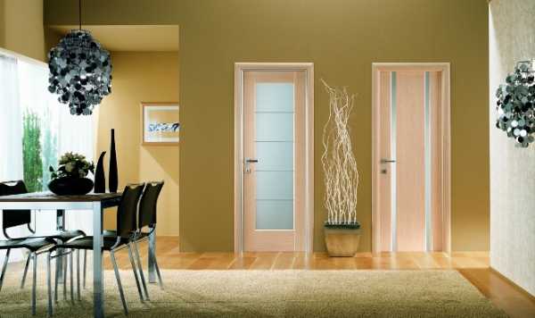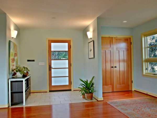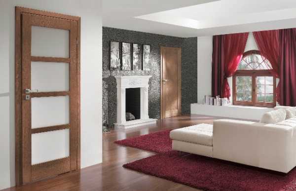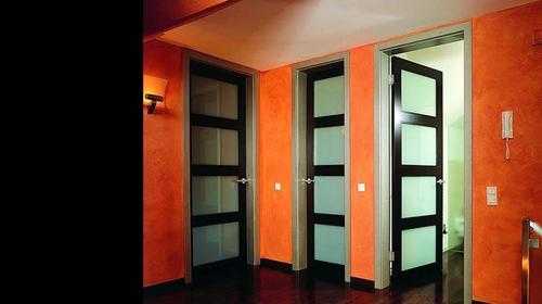 Если цвет меблировки смежных комнат отличается, то отличным решением проблемы будет монтаж шпонированных межкомнатных моделей. Стороны дверей, выходящие в коридор или холл, оформляют одним цветом. А для других сторон подбирают индивидуальное цветовое оформление. Стеклянные вставки при этом сыграют роль объединяющего элемента.