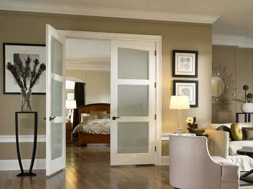 Полотна со стеклом отлично смотрятся в комнате любого назначения. При выборе дверей надо учитывать, что полотна с большими стеклянными вставками обладают низкой шумоизоляцией. Для спальни подбирают матовые, рифленые стекла фигурных форм небольших размеров. Полотна с матовыми, тонированными элементами устанавливают в ванных комнатах, чтобы сохранить приватность.
