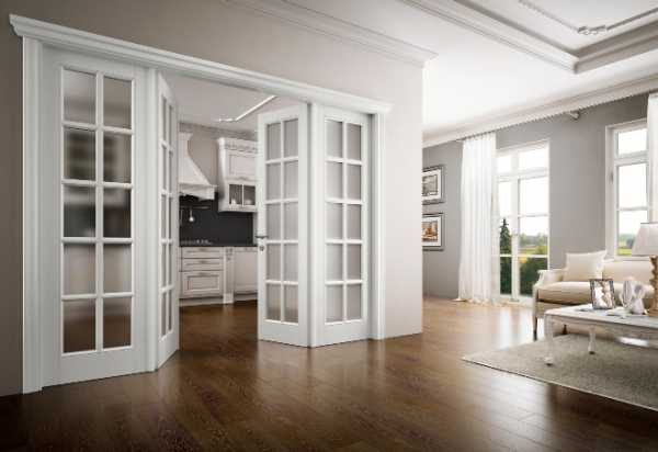 - раскладные двери функционируют по типу гармошки – состоят из нескольких створок;