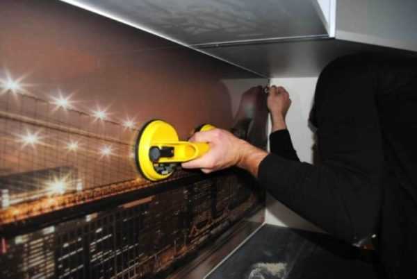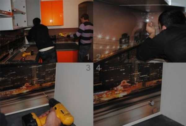 Здесь, наверное, все понятно. Вместо крепежей используется клеевой состав или жидкие гвозди. Обычно этот способ используется для цветных фартуков, с пленкой и фотопечатью. Прозрачные стекла в этом плане не подойдут, будет видно место нанесения клея.