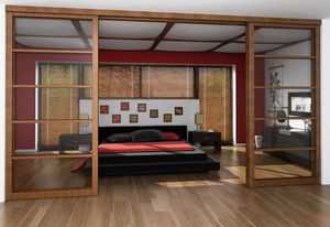 Каркас в этих системах сделан из дерева, а внутри имеет разные типы заполнения: стекло, пластик, зеркало и др. Раздвижные деревянные перегородки в основном предпочитают любители классического стиля в интерьере. Их можно сделать различных конфигураций, вырезать на дереве рисунок. Используются они только в сухих помещениях, т.к. дерево не терпит влагу.