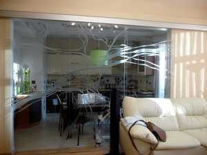 Широкий ассортимент декоративных элементов позволяет создать неповторимую художественную композицию стеклянной перегородки и двери раздвижного типа.