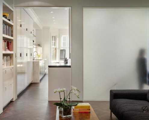 Специалисты советуют при помощи межкомнатных перегородок-дверей из стекла осуществлять отделения особенных участков помещения, например, библиотек, творческих зон или небольших кабинетов.