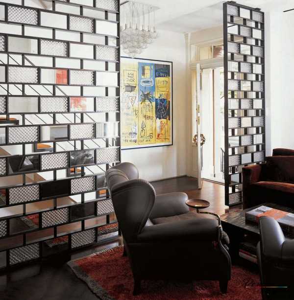 Эта декоративная перегородка для дома выполняет 2 функции: изолирующую и дизайнерскую. В общем, универсальна. Но подойдет для помещений, где мало мебели, как здесь. Если комната будет сильно заставлена, лучше брать перегородку в полстены. И желательно, чтобы стекло местами было прозрачное.