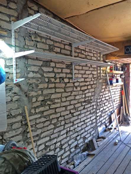 Монтаж сетчатых полок на боковой стенке гаража — быстрый вариант для нетяжелых предметов