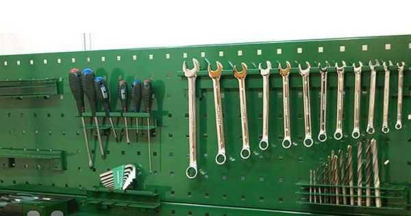 Мелкий ручной инструмент типа ключей, отвёрток, плоскогубцев и прочего удобнее хранить не в ящиках насыпом, а на стеновом щите-органайзере