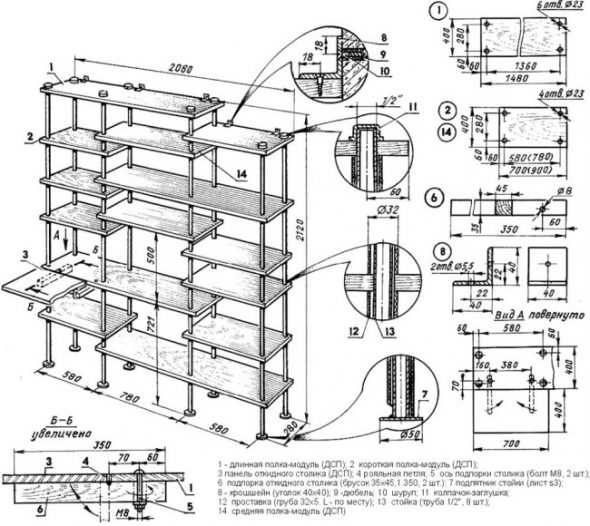 Чертеж стеллажа из труб с деревянными полками