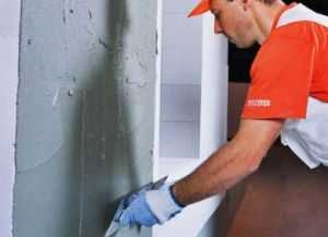 - Готовая смесь наносится на стену ровным слоем посредством шпателя. Затем по месту проводят специальным скребком, в результате получатся борозды. В этом случае материал хорошо схватится с гипсокартоном.