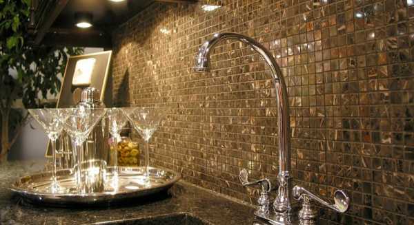Шикарно смотрится фартук, облицованный мозаичной плиткой с блестящей поверхностью