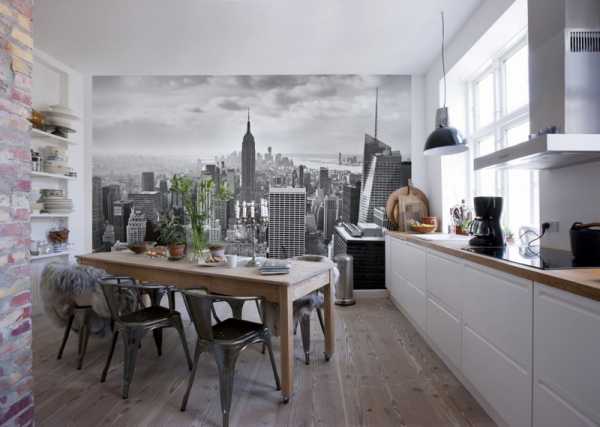 Фотообои располагаются на одной стене, это может быть поверхность над столешницей. Для долговечности и простой уборки лучше прикрыть фотообои листом закаленного стекла.
