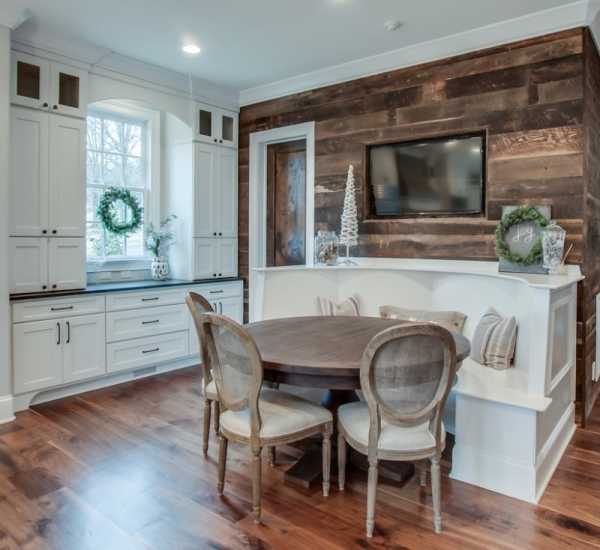 Удачное сочетание темного дерева с белым кухонным гарнитуром