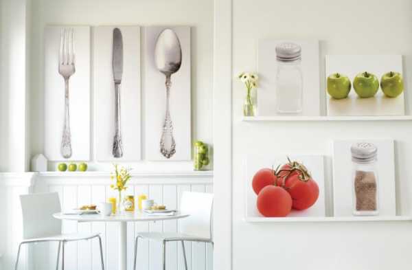 Еще один интересный способ декорирования стены – использование коллажей. Их обычно помещают в обеденной зоне. Коллажи можно оснастить чем-то полезным, какой-то мелочью: полочкой, крючком для прихваток или блокнотом для записей лучших рецептов.