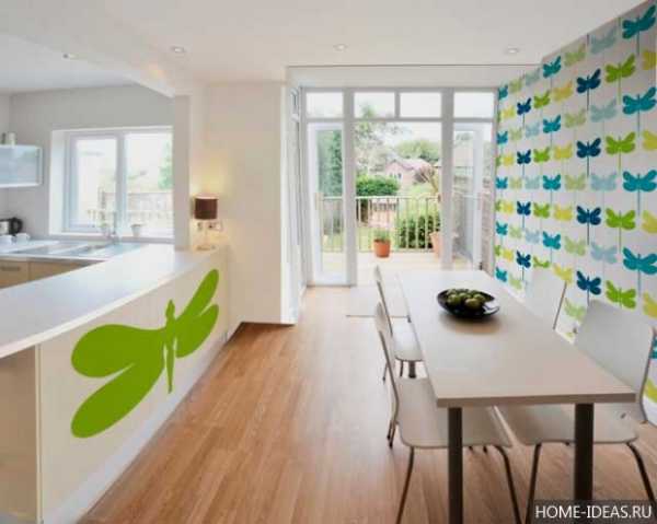 В кухне-гостиной на фото оклеенная активными обоями стена дополнительно работает на «маскировку» кухонного гарнитура, отвлекая от него внимание.