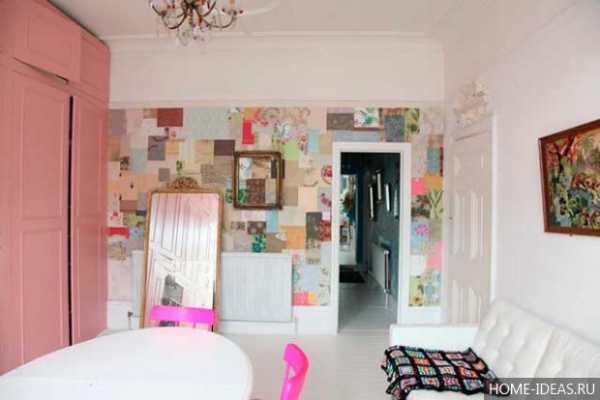 - Лоскутный способ. Очень оригинальный и необычный вариант, при помощи которого можно преобразить любое помещение. Суть его заключается в том, что обои двух видов нарезаются на квадраты одинаковой формы (либо треугольники или прямоугольники) и поочередно наклеиваются. Главное условие: кусочки должны сочетаться между собой.
