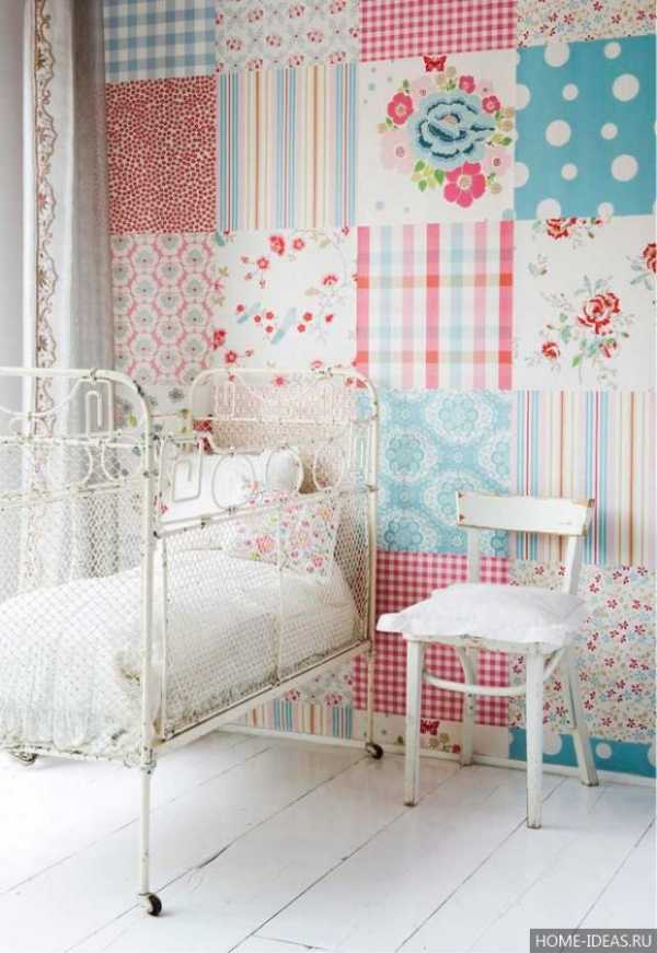 Лоскутный креатив. Если вам хочется чего-то необычного и оригинального, например, для детской комнаты, то оформите одну стену в стиле лоскутного одеяла. Здесь можно применить даже не два, а три и четыре варианта обоев. Главное, чтобы они гармонировали друг с другом. Нарежьте их на большие квадраты и наклейте в свободном «шахматном» порядке. Остальные стены оформите однотонным полотном в тон «лоскутных» обоев.