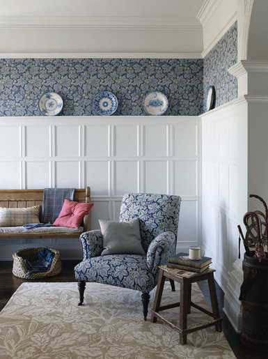 При горизонтальном делении стен путем комбинирования обоев необходимо использовать бордюр для оформления стыков. Подойдет и бумажный бордюр, и полиуретановый молдинг, и деревянная рейка, и потолочный плинтус — выбор, как правило, зависит от стиля интерьера и от толщины обоев. Так, если обои одинаковой толщины, вполне можно обойтись бумажным бордюром. Но если толщина обоев разная, бумажный бордюр может лечь неровно.