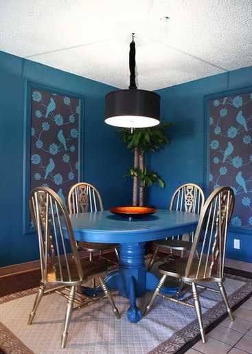 Еще один способ комбинирования обоев — обойные вставки. В этом случае, помещение оклеивается однотонными обоями, а наверх приклеиваются другие обои самых разных форм и цветов. Чаще всего они имеют какую-то яркую текстуру или замысловатый узор. Их граница, как правило, оформляется молдингом, создавая красивую раму. На самом деле, такой способ больше напоминает картину с узором, висящую на стене.