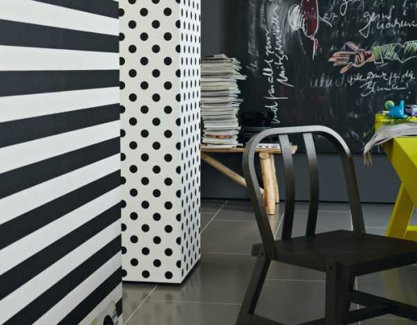 Один из самых простых, но довольно эффектный — наклеивание вертикальных полос одинаковой ширины и текстуры через одну или через две. Для такого способа подойдут обои контрастных цветов или двух отличающихся оттенков одного цвета. Также можно комбинировать монохромные обои или с изображениями персонажей мультфильмов.