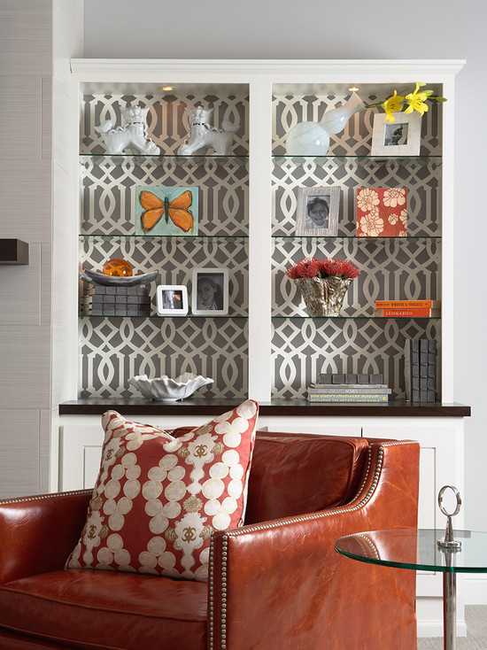 Чтобы привлечь внимание к нише или выступу, их можно оклеить контрастными обоями или обоями с орнаментом при однотонной отделке стен. Помещение сразу «заиграет».