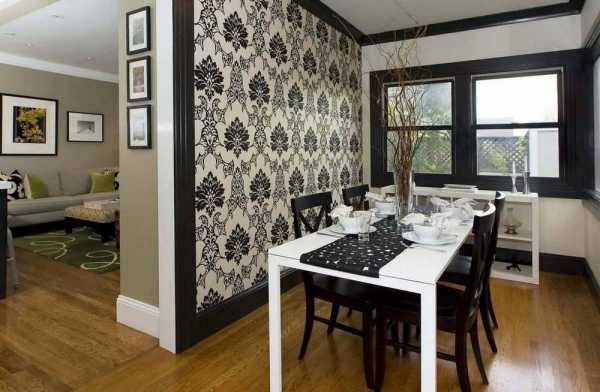 Комбинирование обоев на кухне прежде всего может пригодиться для зонирования помещения. Отделить рабочую зону кухни от обеденной можно, например, сделав акцент на одной из стен или подчеркнув вставками из обоев место для приема пищи.