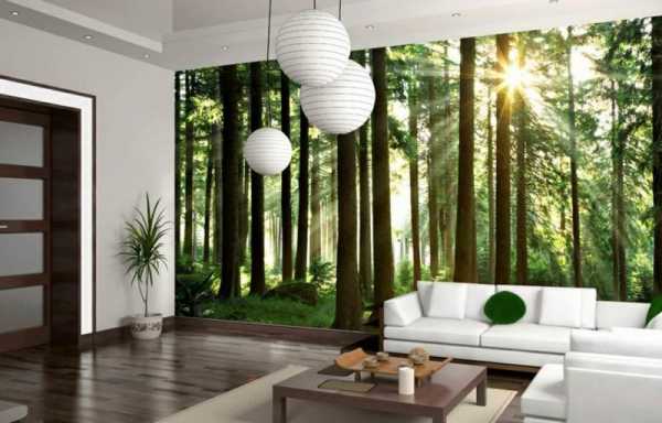 Лесной пейзаж на обоях в комнатеВ спальне допустимо использовать простые спокойные сюжеты. Отлично смотрится природная тематика, в то время как городская здесь совсем не к месту, если хотите приобщиться к городу, просто посмотрите в окно.