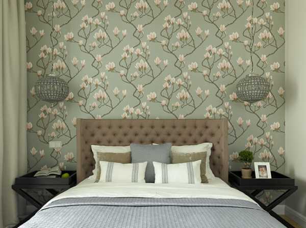 При использовании обоев с мелкими деталями желательно не заставлять пространство у таких стен крупной/высокой мебелью. Компромиссный вариант – оформление такими обоями стены у прикроватной зоны. Для остальных поверхностей лучше выбирать покрытие с подходящими оттенками приглушенных тонов.