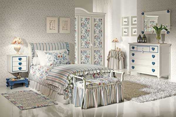 Стилистика прованса идеально подходит для декорирования спальных комнат. Причем уместно на стенах в стиле прованс смотрятся любые орнаменты или узоры.
