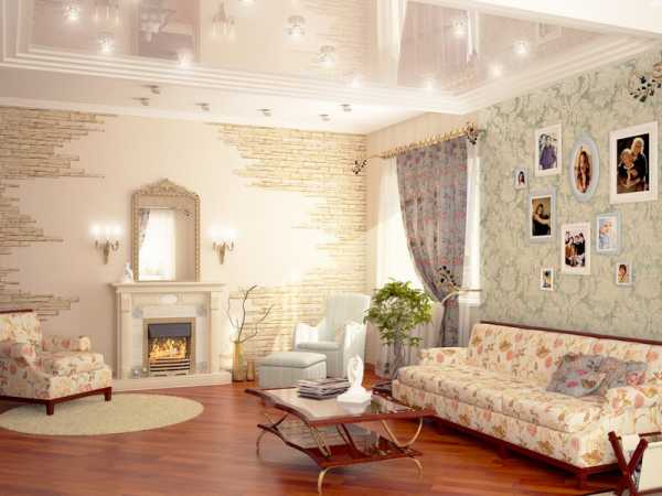 В гостиной в стиле прованс может удачно соседствовать отделка разного типа. Например, обои разных расцветок и фактур, деревянные панели и обои с цветочным узором или фотообои с имитацией кирпичной кладки.
