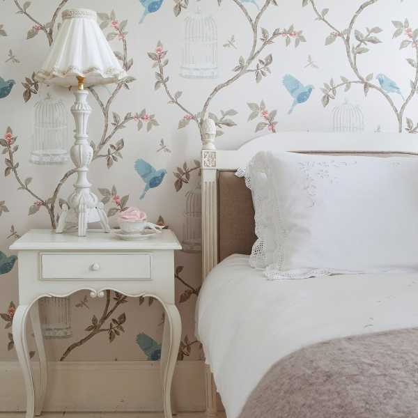 Стены украсят обои с цветами, птицами или ягодами. В комнате будет хорошо смотреться сочетание обоев компаньонов. Удачным решением станет отделка одной из стен фотообоями.