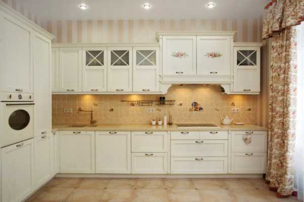 На фото кухня в стиле прованс в светлой цветовой гамме. Отделка стен выполнена жидкими обоями и плиткой.