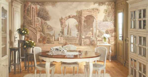 На фото столовая в стиле прованс. Фотообои с перспективой зрительно увеличивают пространство комнаты.