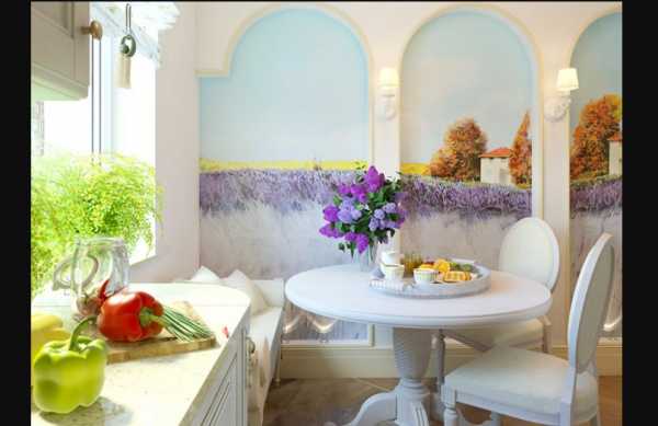 Другим вариантом отделки в стиле прованс станут жидкие обои или с имитацией штукатурки. Фотообои помогут зрительно сделать кухню просторнее, например, с картиной удаляющихся лавандовых полей.