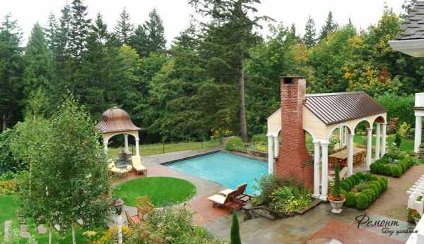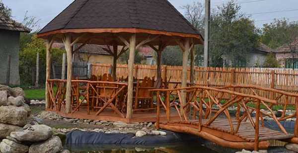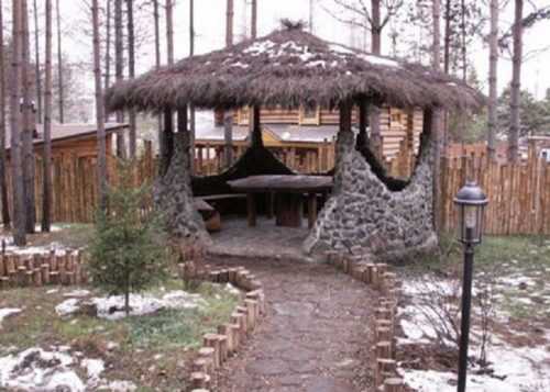 Для сельского дома и беседки лучше выбрать «деревенский» стиль, все постройки выполнить из дерева.
