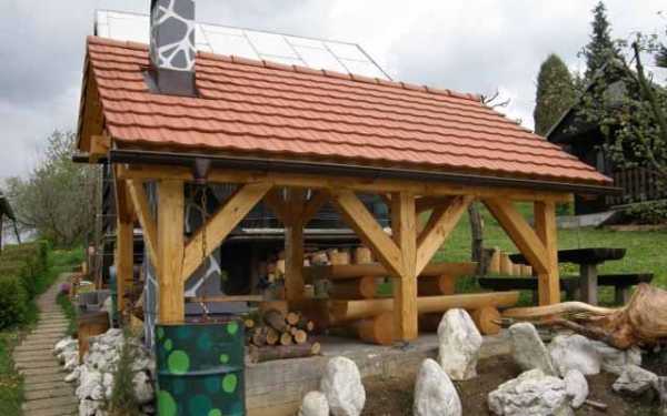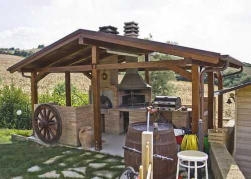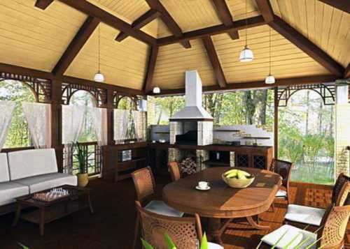 - Беседки для барбекю. Их конструкция предусматривает возможность готовки продуктов на открытом огне при помощи мангала или барбекю. Как правило, в большинстве случаев они имеют открытый вид. Впрочем, для обеспечения пожарной безопасности довольно часто их оборудуют качественными дымоходами.