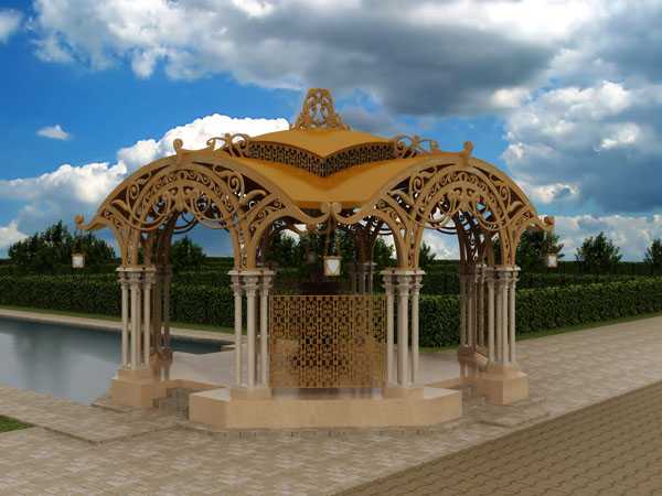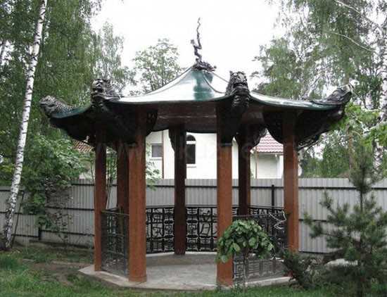 Восточный. Данный стиль предпочитают любители экзотики. Такие беседки изготавливаются, в основном, из металла и дерева, и представляют собой так называемую пагоду с многоярусными крышами.