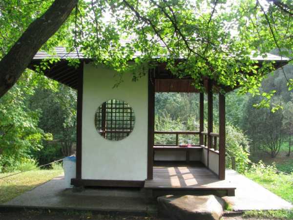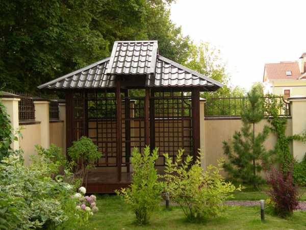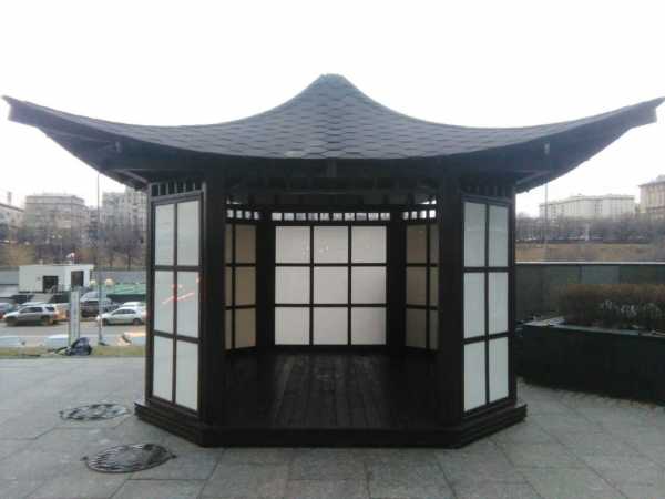 Идея: Чтобы внести в дизайн такой конструкции побольше восточных ноток, стоит обсадить ее розами и украсить витражами.Беседка в японском стиле так же, как и в китайском хорошо будет смотреться и в большом саду, и в маленьком дворике.