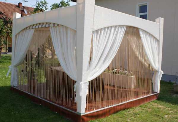 Идея: Очень красивые беседки для дачи получаются при использовании в оформлении текстиля. В дизайн застекленной конструкции наверняка гармонично впишутся легкие занавески. Иногда шторами украшают и открытые беседки.Украшение снаружи