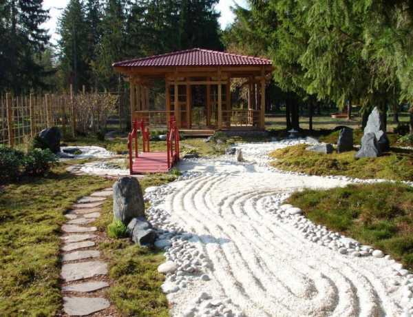 Здесь мы видим влияние экзотического Востока: мостики, выполненные в китайском стиле, пагоды, беседки…. Таинственность навевают мотивы готики, где-нибудь в уголке прячется беседка-пергола, придающая некоторую загадочность общему пейзажу.