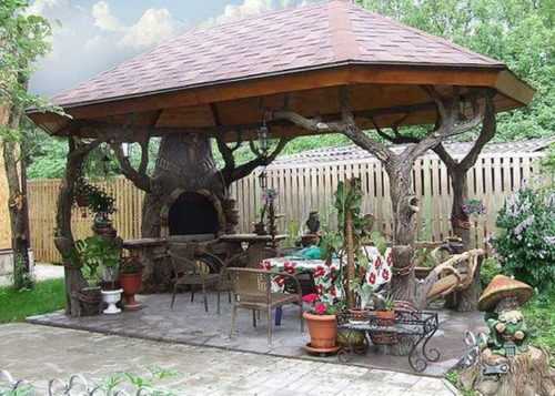 Совсем другое дело – многогранные красивые декоративные беседки. Такую форму стоит выбрать в том случае, если сооружение является достаточно важным элементом оформления двора. Бывает и так, что дизайн участка строится именно вокруг беседки. В этом случае лучше выбрать и вовсе какое-нибудь оригинальное красивое оформление. К примеру, сделать постройку в виде кареты, корабля, замка с башенками и т.д.