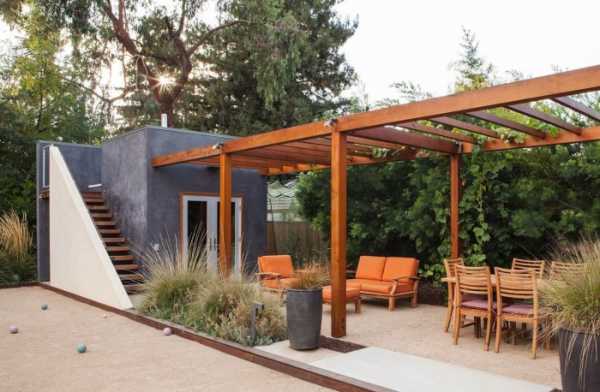 Если дом выполнен в стиле «минимализм», то главными материалами следует выбрать бетон, стекло и металл. Продолжит композицию легкая беседка из стекла.